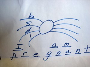 After they finally guessed the sentence (it took forever), only one kid (out of 5) understood the significance of it.  And she was so excited, the rest of them were saying, “WHAT? WHAT?  WHAT DOES IT MEAN???!!!!”  So I told them “a baby”, pointed to my stomach, and then I got lots of big grins and hugs and congratulations!