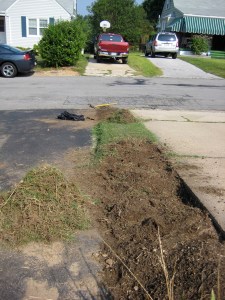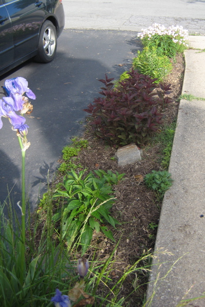 That’s a bed of really ugly, weedy grass that used to exist between our driveway and our neighbors’. One day I just got sick and tired of constantly battling with it to keep it from eating our our asphalt. Plus it was ugly. So I just started hacking at it. And after long hours of work (with help from Tina and Nik), we finally got all the grass out. (It was a much bigger project than I’d counted on!) Then, I removed several wheelbarrow loads of dirt in an attempt to make it relatively level and Tina and I transplanted in a bunch of perennials that came my way, for free mostly, from other gardeners.