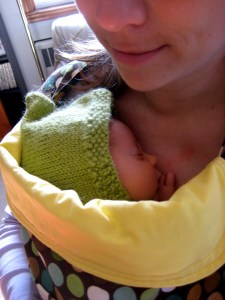 The mei tai that I made works with little babies too!  Meggan and Rachel, Mom will show you how to do it when she gets home.  (Actually it’s not hard at all.  You basically just put the baby in the curled up “fetal” position on your front and tie the straps across the back rather than under the bottom.)  She’s still a little too small for me to be able to move quickly in it because her head isn’t really supported by it.  But I wore her in it when we were out today for appointments and it worked great.   And it’s making it possible for me to type this blog entry right now!