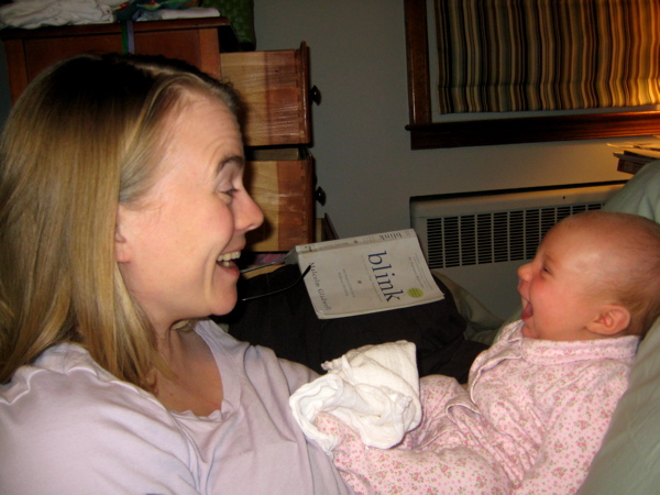 ETA: Zona’s right – she wasn’t actually laughing with me – just really big smiles. But it felt like laughing! 🙂 So the title probably should have been, “Major smiles with Mama and Baba.” Although, she’s definitely chuckling in her sleep now!