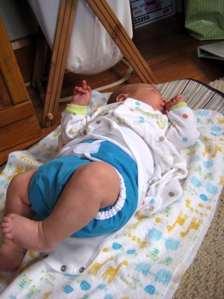 Proof that we have finally entered the world of cloth diapering!  Mom did the hard work of preparing our prefolds for use and now we’re finally using them.  For those who know about these things, right now we’re using organic unbleached prefolds with Thirsties covers.   My friend Julie also very generously gave us her supply of Fuzzi Bunz pocket diapers so we’ll start using those soon too.  We’re still using disposables at night and I haven’t quite gotten  to using the cloth wipes I made this summer.  But at least we started!