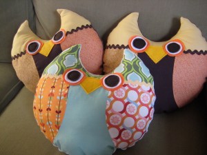 For my three-year-old nephews and niece (Alex, Alex, and Ezra), I made owl pillows, using this blog post as inspiration.  This was my first foray into pattern making and it was fun!