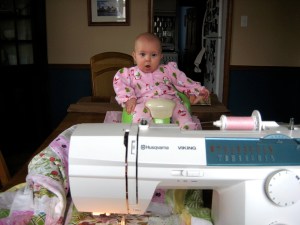 P.S. Many of you have asked me how I have time to sew.  For one thing, I moved my machine and some supplies downstairs from my sewing room into the dining room.  Also, right now, Ellie is willing to sit in her Bumpo chair usually for at least 15-30 minutes, especially if I catch her right after her nap.  I’ll have to figure out new ways to find the time once she outgrows that chair but it’s working for now!