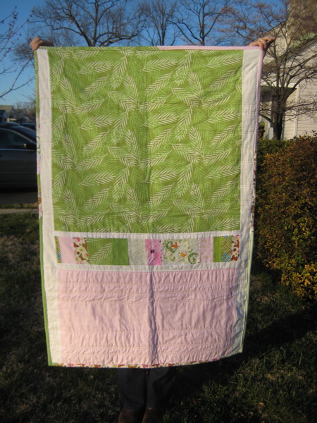 I quilted it with straight lines in light pink and bound it with a pieced binding made from some of the fabrics in the quilt along with a leftover strip from the pieced part of the quilt. I love it!