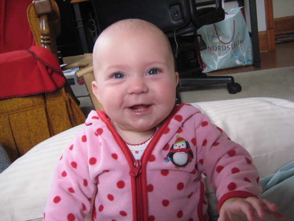3. It was in the eighties yesterday so we ate dinner outside in the shade on our lawn.  Ellie has spent plenty of time outside but this was her first experience with a fairly strong wind.  It was nice and warm but still gusting pretty hard.  It was so much fun to see her catch her breath in surprise every time a gust came by her!  She would take a sharp intake of breath, blink a few times, and then grin at us!  There are so many new things to experience when you’re a baby!