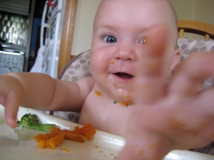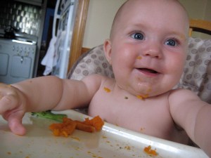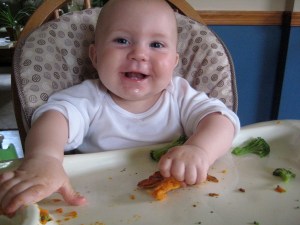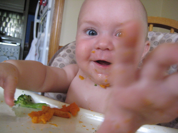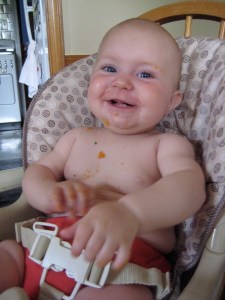 It took five days of playing with her food but Ellie finally started eating! It’s still very small amounts but she seems to have figured out that what we put on her tray is for putting in her mouth. So far she’s had plenty of sweet potato and broccoli and today we added carrots and peaches. Her favorite so far? Broccoli! Her most disliked? Peaches! We can our own peaches in the summer and they are by far the most delicious peaches you’ve ever had. And when she put it in her mouth, she made the craziest faces (as in, “Gross!”) and spit it out! So it may take her awhile to get used to fruit!
