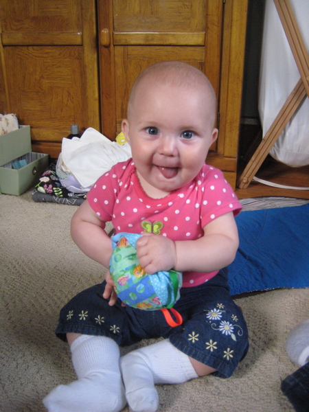 Ellie is really asking for things to play with now – as in, she gets bored and whiny pretty quickly.  So I’ve been slowly getting out the toys that we were given before she was born.  The other day, I came across this ball that the mother of one of Nik’s friends made for us.  Ellie loves it!  She and Nik have already been playing some fun games with it.  It’s especially easy for her to hold and the ribbons on it are fun to play with too.  Thanks Barb!