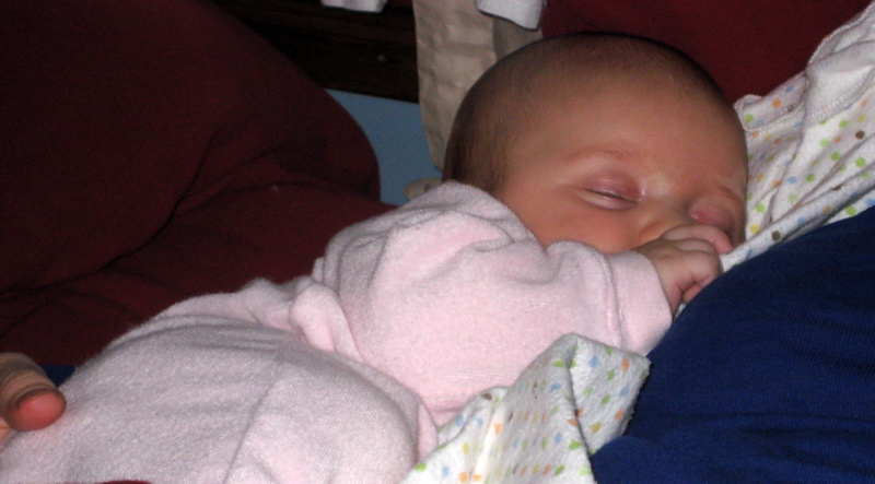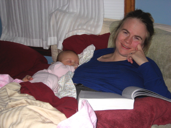 Ellie in bed with me at 2 1/2 months.