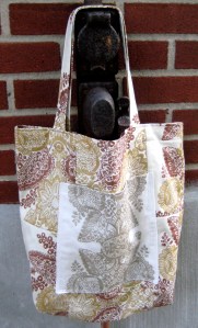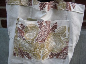 Julie chose this fabric from my stash. This is my birthday present to her, only 7 months late! I plead Ellie as my excuse. The bag pattern itself is very simple. (It’s the same pattern that I used for Katie’s bag.) This bag was complicated because I had to piece the remnants together. So each large panel required four French seams. I also pieced together four strap pieces and then realized that I only needed two. Annoyed at myself and wanting to redeem the situation, I used the two extra strap pieces to make a bonus double pocket with Velcro on the inside. So Julie, my mistake is your gain!