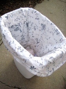 Next I sewed three liner bags to go into the trash can where we keep Ellie’s dirty cloth diapers between washings. I made three and didn’t really get the dimensions correct until the third one. I’m OK with imperfection on a bag for dirty diapers! This is the second one. The third one comes down the pail a bit farther and stays in place the best.