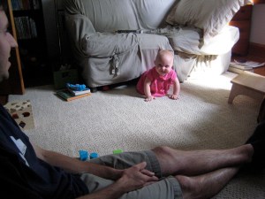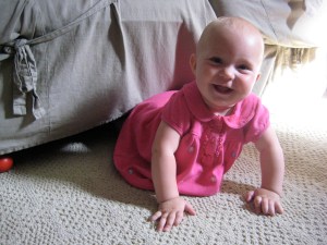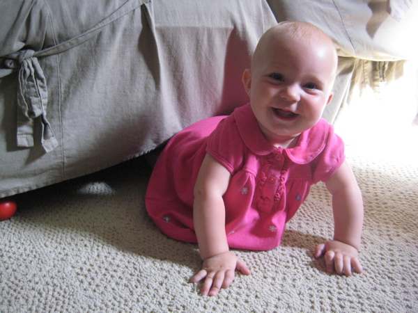 Just to make everyone feel a little better, here’s a couple pictures from about a month ago, before Ellie started crawling forward. At that point she was pushing herself backwards and ending up in funny places!
