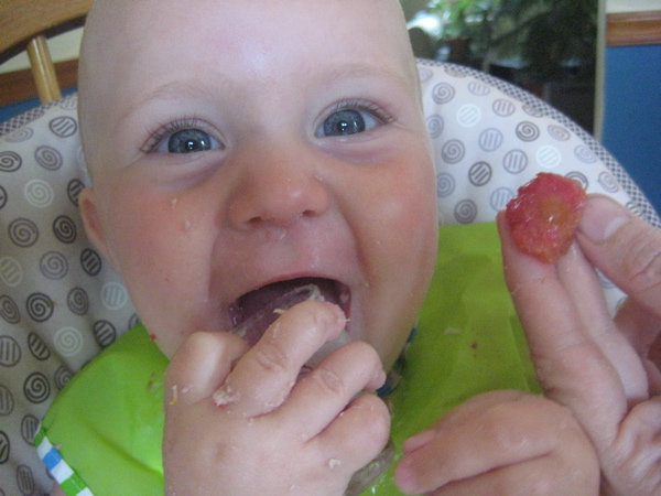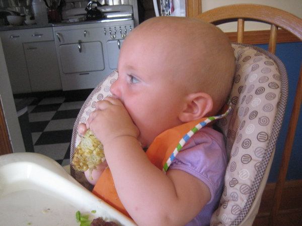 She is also really into eating corn on the cob right now too. At first, I was cutting the tips off to help her get to the corn more easily but now we just hand her the corn and she gnaws on it until she gets some in her mouth.