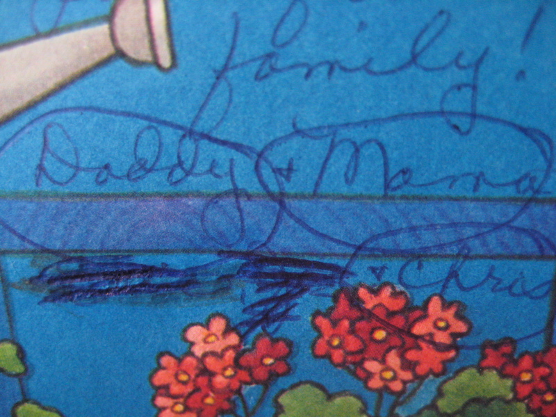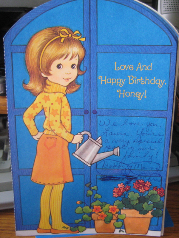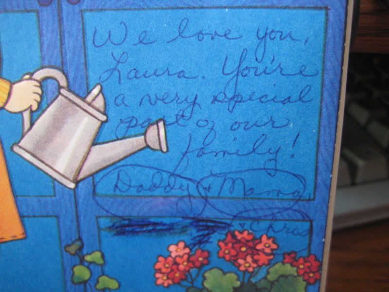 While I was doing this sorting, I came across a card from my childhood. It was for either my 6th, 7th, 8th, or 9th birthday (based on the family members in the card – basically, after Chris, before Rachel.)