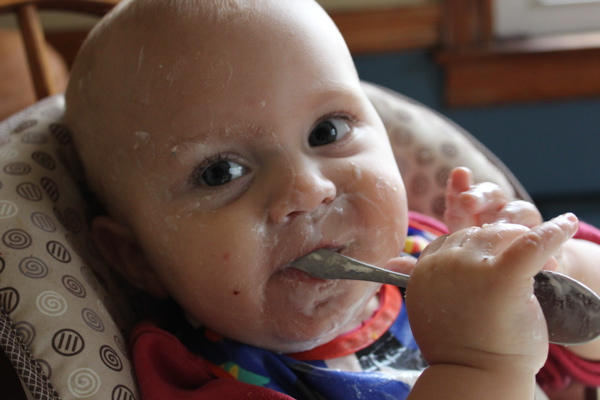 She is very insistent on getting more yogurt into her spoon. She’s also just as decisive when she’s done. Usually it goes something like: more, more, more, throw the spoon!