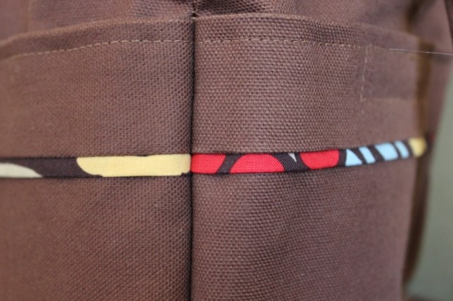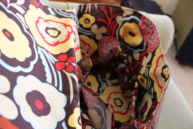 The original tutorial is here, although I’ve made lots of modifications to the pattern.  The outside fabric is duck cloth and the lining fabric is by Alexander Henry.  I bought them both at Joann Fabrics.