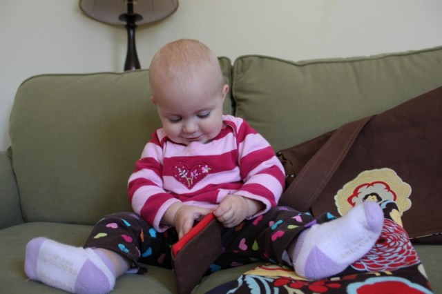 As always, I made a matching changing pad (but backed with blue) and wallet.  Ellie didn’t see too motivated to hold these still for the picture!