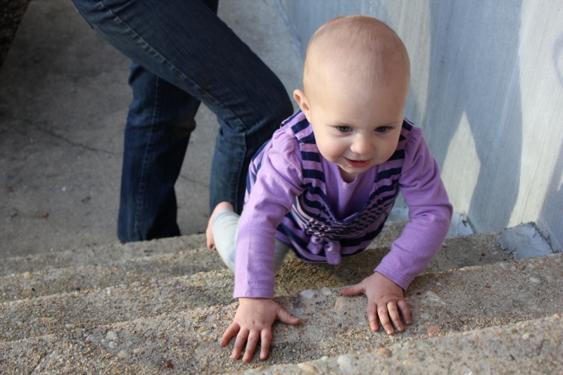 She’s remarkably good at climbing stairs. She’s climbing them now without any hesistation. That seems to be how she’s approached all her developmental milestones (gross-motor ones at least). She just waits until she can do them perfectly and then off she goes.