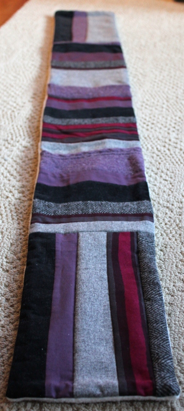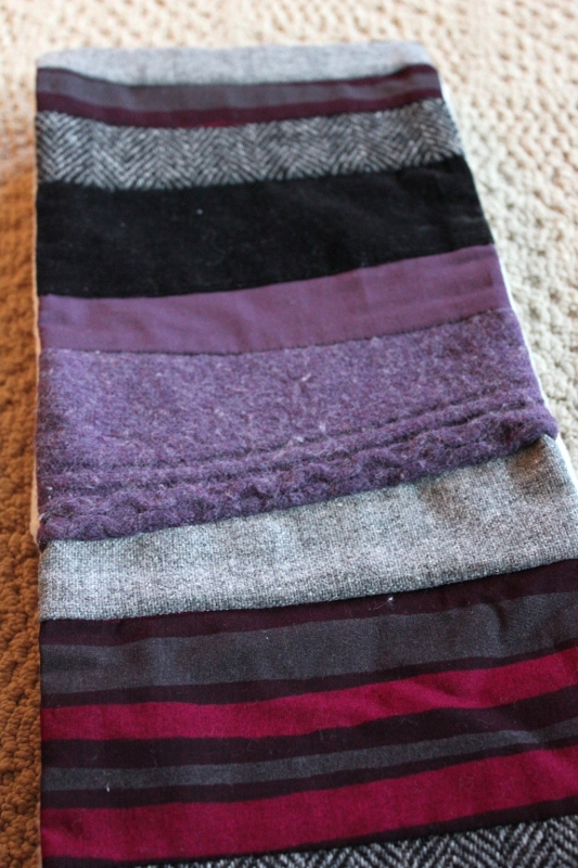 I made this “Scrap Wrap” for my mother from the book, Denyse Schmidt Quilts: 30 Colorful Quilt and Patchwork Projects. I used a variety of fabrics with different textures including two kinds of wool (light gray, black/white herringbone), corduroy (black), quilting weight cotton (plum, stripes), and one of my favorite old sweaters (purple) that wasn’t wearable anymore. I’m glad my beautiful sweater is having a good second life with my mother!