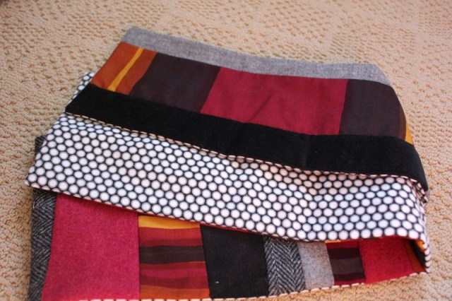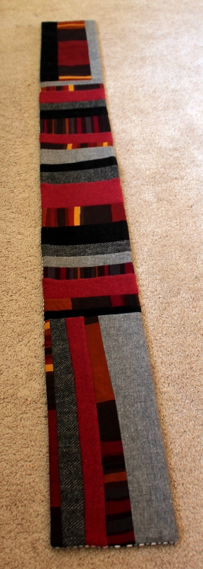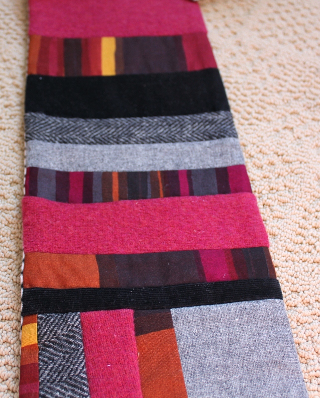I made this “Scrap Wrap” for my sister-in-law, Nikki. Again, I used a variety of fabrics, including the same light gray and black/white wools and black corduroy as in my mom’s scarf. I also used a raspberry wool sweater, which was my favorite sweater for many years – so much my favorite that I wore holes in it. So it too has taken on a second life in Nikki’s scarf!