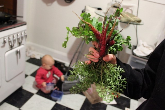 purple carrots, golden carrots, and arugula!