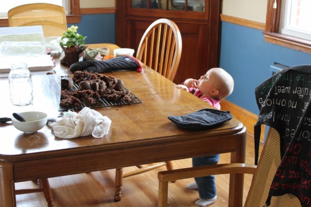 And yes, in the interest of keeping things real, I’m showing you these pictures even though it is apparent that the cake is in multiple pieces on the cooling rack.  Clearly, I didn’t wait long enough before trying to take it out of the pan, even though I’d buttered and floured it.  We’re having dinner at our friends’ house tonight and I’m still going to take it, homely though it is.  Cake crumbs still taste good right?