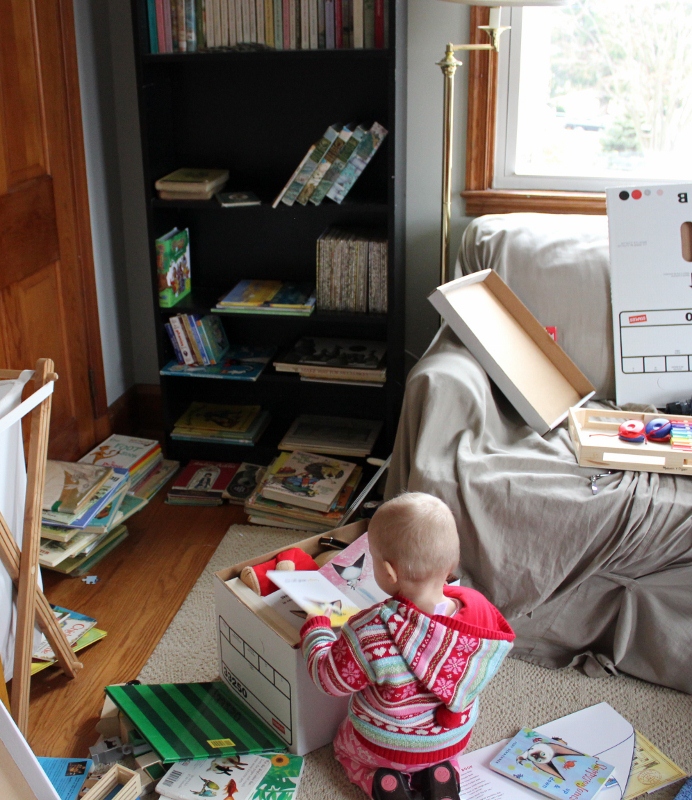 Packing away all these books has actually been really hard/conflicting for me. It feels like we should have TONS of books out, you know? But really, all Ellie does with most of the books is pull them off the shelves and then I have to put them on again. I am hoping that with very few options, she’ll learn to settle down and enjoy the books that she does have. (And yes, I realize that this is an age/maturity issue as well as a “too many books” issue.)