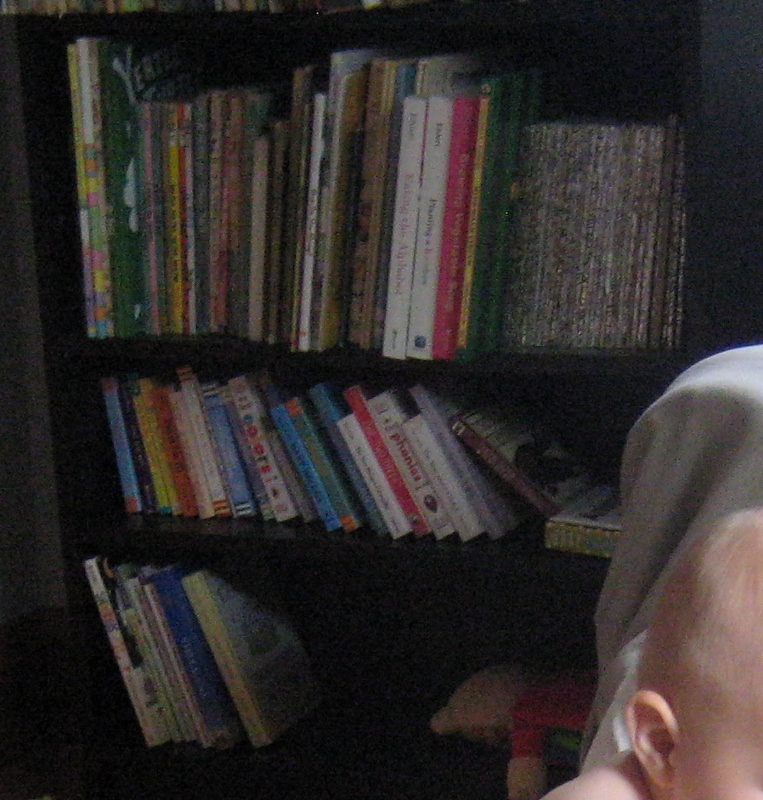 And here’s our bookshelf or at least the bottom three shelves of it. The bottom two shelves are board books, which she is reading right now.