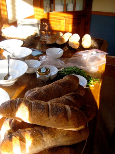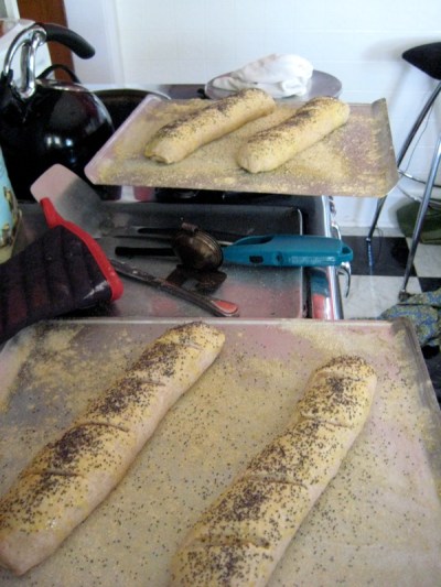 Sprinkle a baking sheet with cornmeal and put the loaves on it. Cut a few diagonal lines in the loaf with a serrated knife (that would be a Double-D edge for us Cutco people).