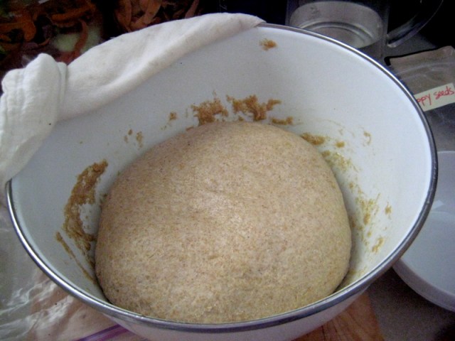 Grease a bowl and put the dough in, flipping it over to get both sides greased. Cover with a damp cloth and let it rise until it has just about doubled in size (usually about 1-2 hours for me). Press the dough down and then let it sit for about 20 more minutes. Then split the dough into three parts and form each section into a loaf. I usually use a rolling pin to roll my dough into a rectangle and then roll up the rectangle.