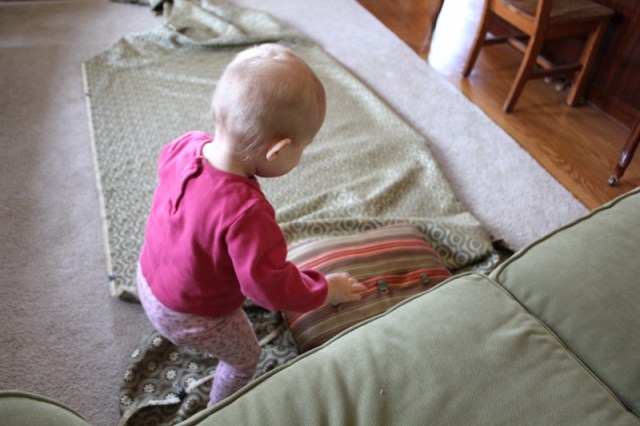 After we’d rolled up the fabric , she had fun pushing it across the living room.