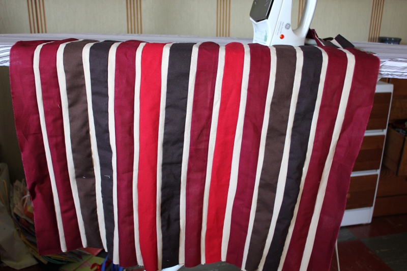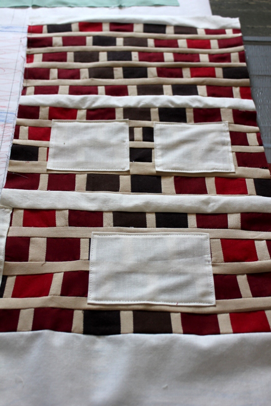 So, I sewed a bunch of strips together – various shades of red and brown for bricks and tan for mortar, like so: