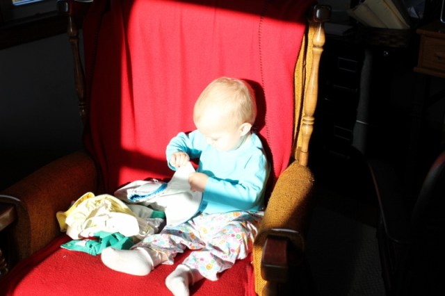 Today, she brought them up, put them in the recliner, and then happily played with them for several minutes while I was doing other things – again, helping Mama!