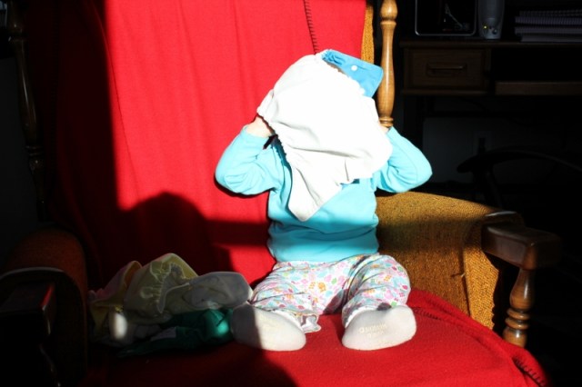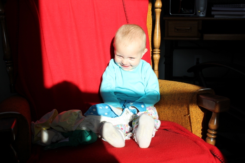She absolutely adores going down to the basement to do laundry with me.  When we wash the diapers, she always carries the covers upstairs (the covers in her arms while she is in my arms).