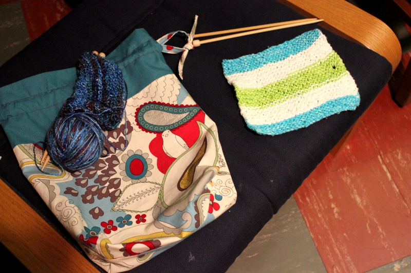 Tuesday night, Betsy and I finished our first set of projects. She made a drawstring bag (from this tutorial) for her knitting projects and I knitted a dishrag that turned out relatively nicely. Not too bad for our first attempts! 🙂