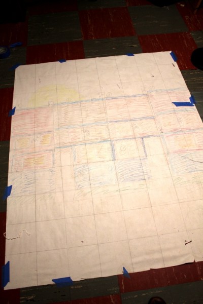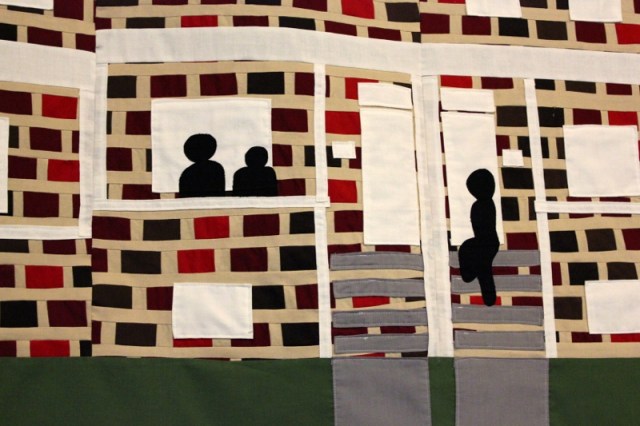 My friend Joanna and I collaborated on this project.  I shared with her my vision for translating  a specific section of row houses in our church’s neighborhood from brick into fabric.  She took our brainstorming, consulted a few pictures I’d taken, and came up with a wonderful sketch.  She did this when her baby was only a month old too!  Amazing!  I used that sketch and a grid to translated it into a full-size drawing (4’x5′).