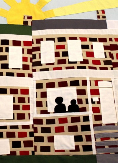 After I had all the details appliqued to the front of the rowhouse, I sewed a strip of blue fabric to the top of each rowhouse and then sewed all the rowhouse/sky combos together to get one block.  The rowhouses are slightly graduated in height so I couldn’t just do one big piece of blue.  Once I had the giant rowhouse/sky piece complete, then I sewed on the three strips for the grass, sidewalk, and road (which already had the words on it).  Then I sewed on the sidewalks, the sun, the rays, and the chimneys (made from brick scraps).  I used WonderUnder to fuse the people and letters to the banner and then I also sewed them on for good measure.