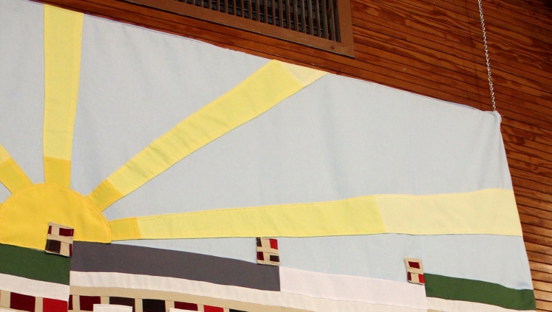 At this point, I was basically despairing of ever finishing the thing because the rowhouses took me many, many more hours to make than I’d anticipated.  Thankfully, the rest of the banner came together quickly, including the sun.  I had been dreading making the sun because of the problem of making the rays get progressively bigger.  But then I just applied some basic slope of a line math and voila!   Nik, the math teacher, is always proud of me when I apply math, sometimes complicated, to my sewing (which happens surprising often, actually).