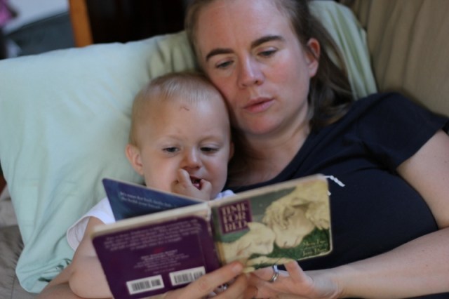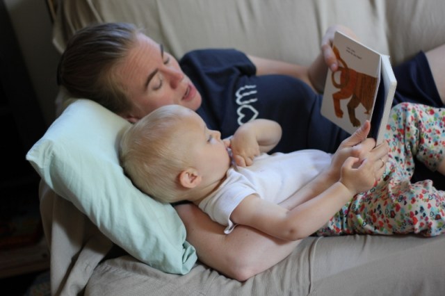 This is currently her favorite position for reading: reclined, tucked in tight against us, soaking in love and attention. Not a bad way to read a book!