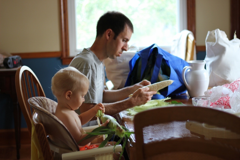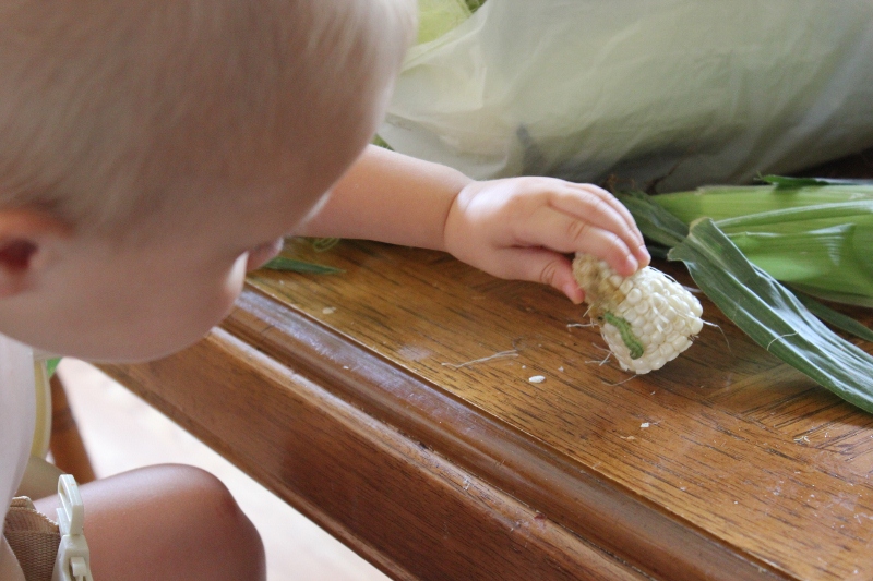 Ellie loves husking corn (in theory) so she wanted to sit at the table and help too.