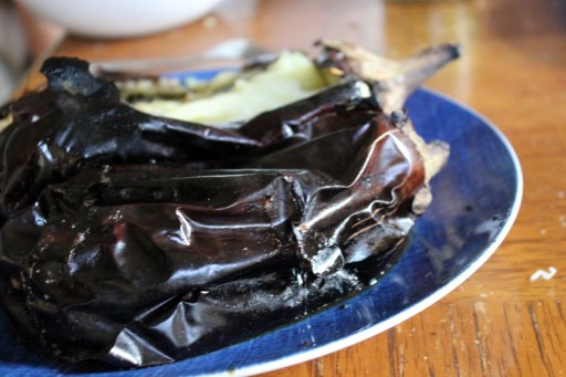 Wash the eggplant well. Roast it whole on the grill or in the oven (rotating a few times) until the eggplant is completely soft. You want it to look totally collapsed like this: