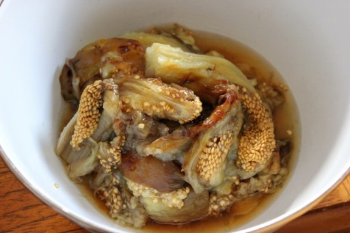 After taking off all the skin. I used an fairly large eggplant this time so you can see there are a lot of seeds. If you don’t like the seeds, then just cut out the worst of them before continuing with the recipe.