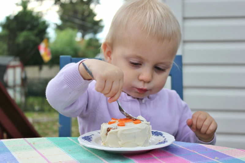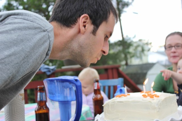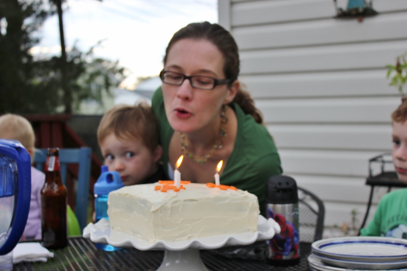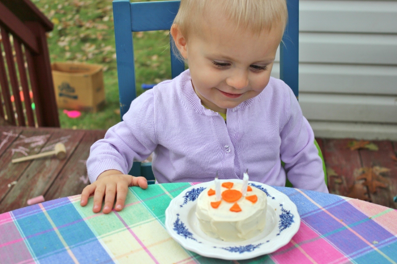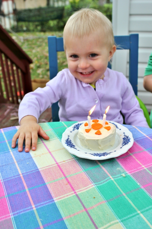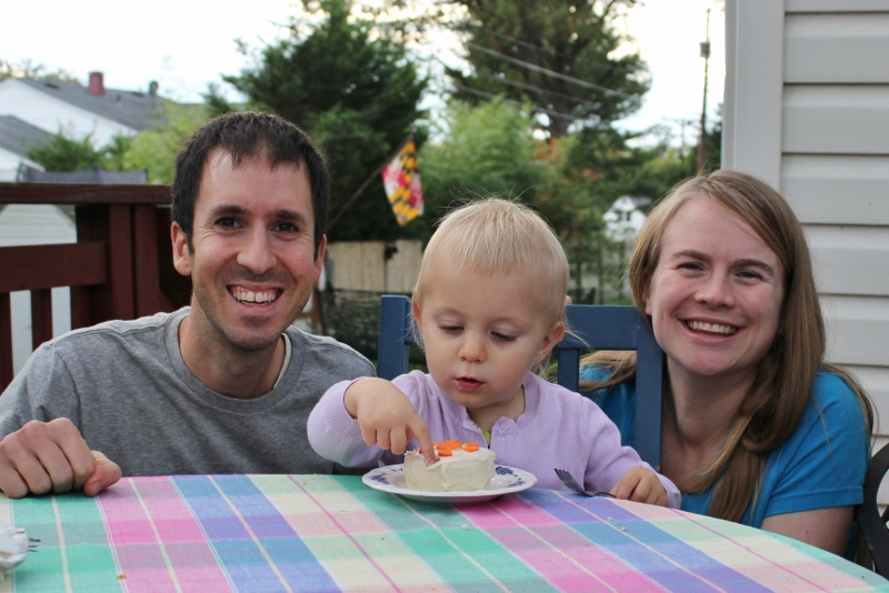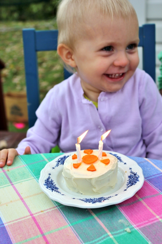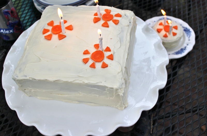 The main event was, of course, blowing out our candles and eating cake.  I made my favorite carrot cake*: a big square cake for all of us and  a little round one for Ellie.