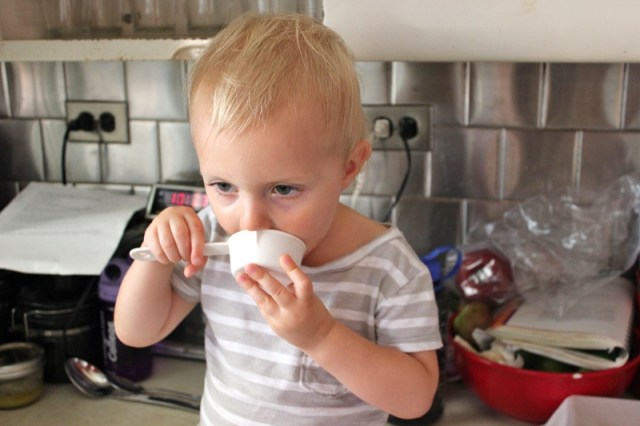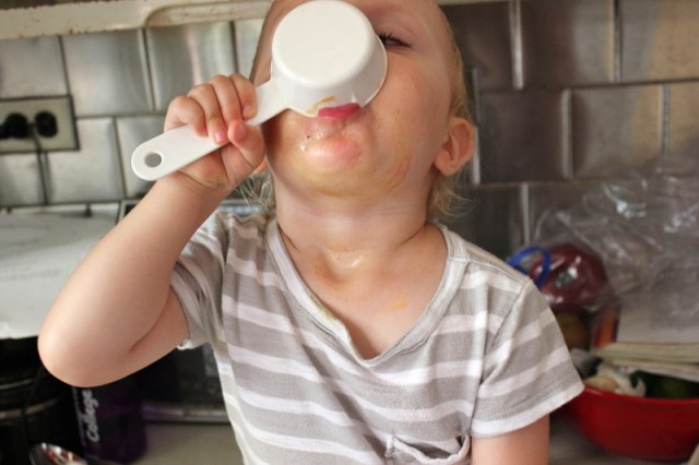 Last week, I let Ellie help me lick out cake batter left over from her birthday cake.  This was her first time experiencing such a delight and it didn’t take her long to dive in!