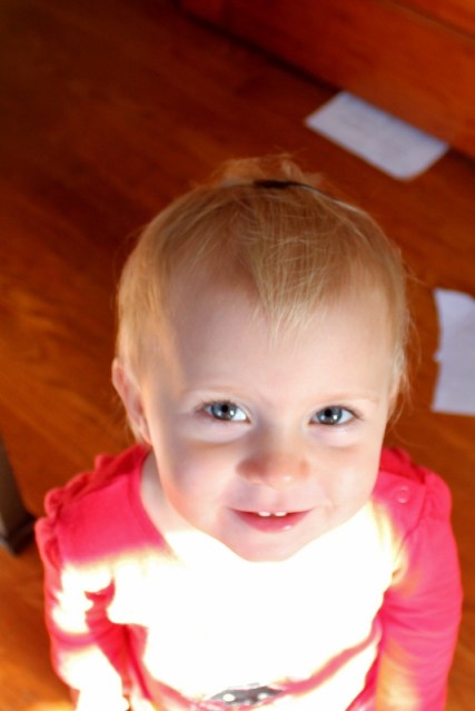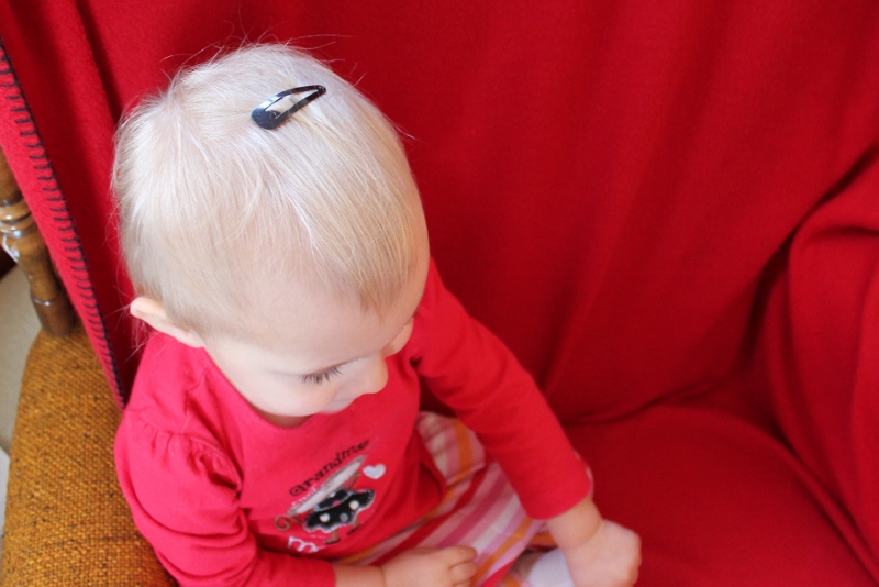 Luckily, I do have one kind of clip that will stay in her hair for long enough to appease her adornment interest.  One of these days she’ll have lots of hair!  (Until then, I’m enjoying the ease of no hair brushing, no hair cuts, and no hair in her eyes.)