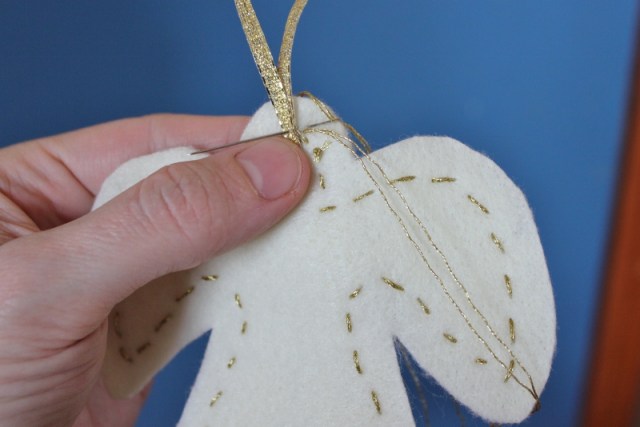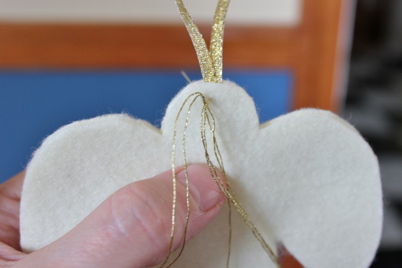 4. Take the two pieces apart.  Put a new piece of thread on your needle. (Use a relatively long piece so you’ll be able to sew all the way around the angel without needing new thread.)  Fold the ribbon in half to form a loop and sew the two cut ends to the inside of the front piece of felt at the top of the head.  Don’t go all the way through to the front of the angel when you are doing this.