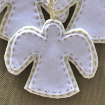 1. Using the template, cut out one angel in white.  If you’d like, you can trace the shape onto the felt using a permanent marker.  If you do this, be sure to cut just inside the marker line so that the marker doesn’t show on the ornament.  Otherwise hold the template to the felt and cut out the shape.