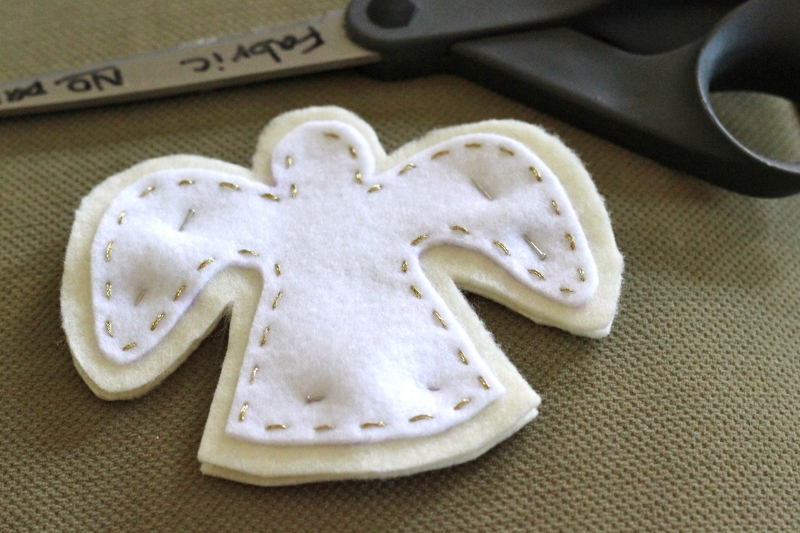 3.  Put the finished front piece onto a second piece of cream felt and cut around the outer perimeter of the angel.  At this point, it’s easier if you pin the two pieces together.