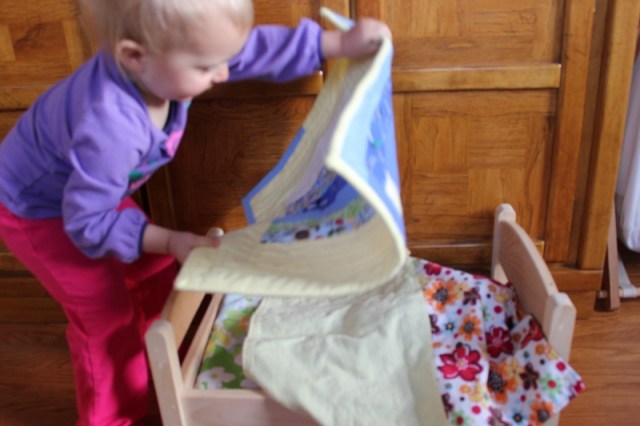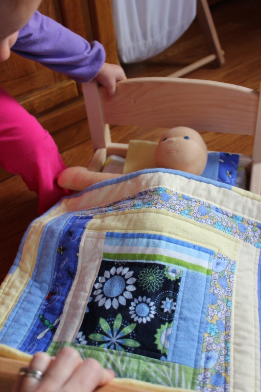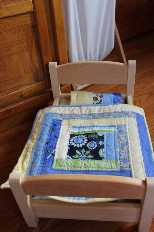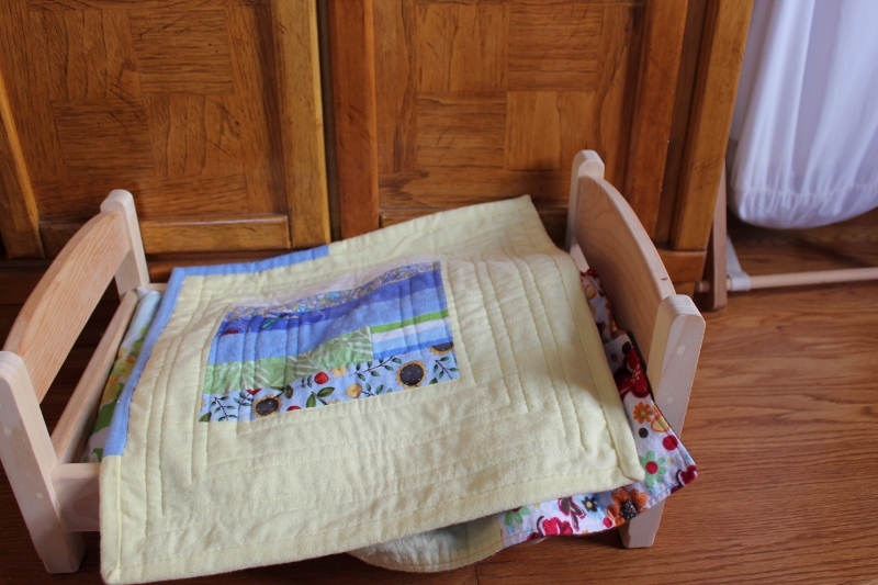 Grandpa bought Ellie a wonderful doll bed for her birthday and so I decided to make a little bit of bedding to go with it.  (My dad bought the bed from this shop, which is based in Maine, and we’re so happy with it.  It’s unfinished solid wood and really sturdy, which is great because Ellie likes to sit on it.)