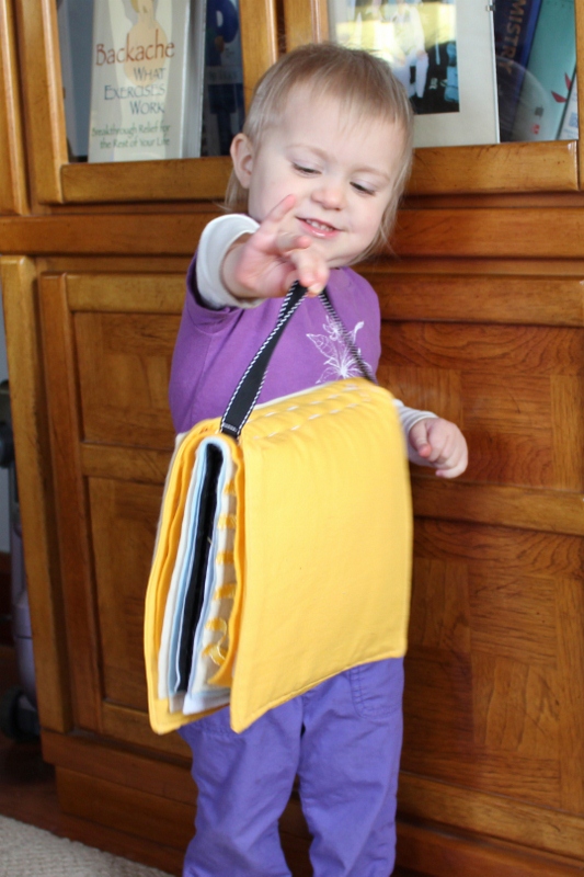 If you’ve been reading my blog for a year or two, then you may remember that I’ve been part of making several baby quilts (here’s Anne’s, Steph’s, Betsy’s, and Heather’s).  Those four women surprised us with a Busy Book for Mark, which Ellie has decided really belongs to her.  We love it – it’s made from felt (except for the cover) and has so many fun activities.