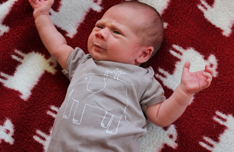 We bought a special sleeper for Ellie to wear home from the birth center and we have it in her little box of memories. We wanted to have something similar for Mark . We ended up buying him (who at the time, we only knew as B2) a little screen printed onesie from Red Prairie Press, which we found at Holiday Heap.
